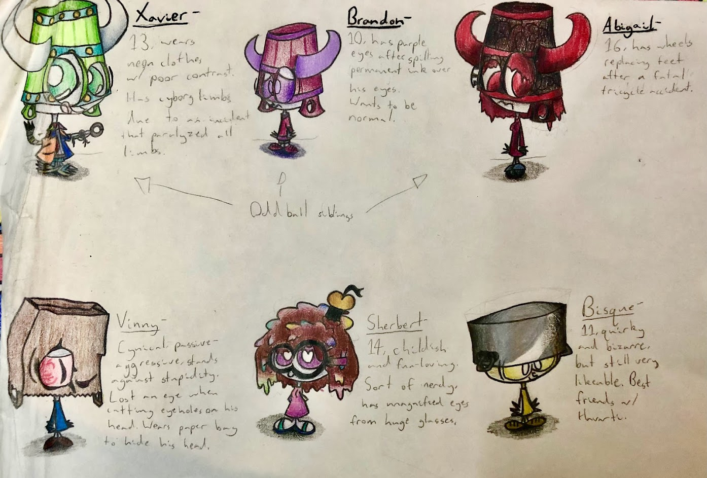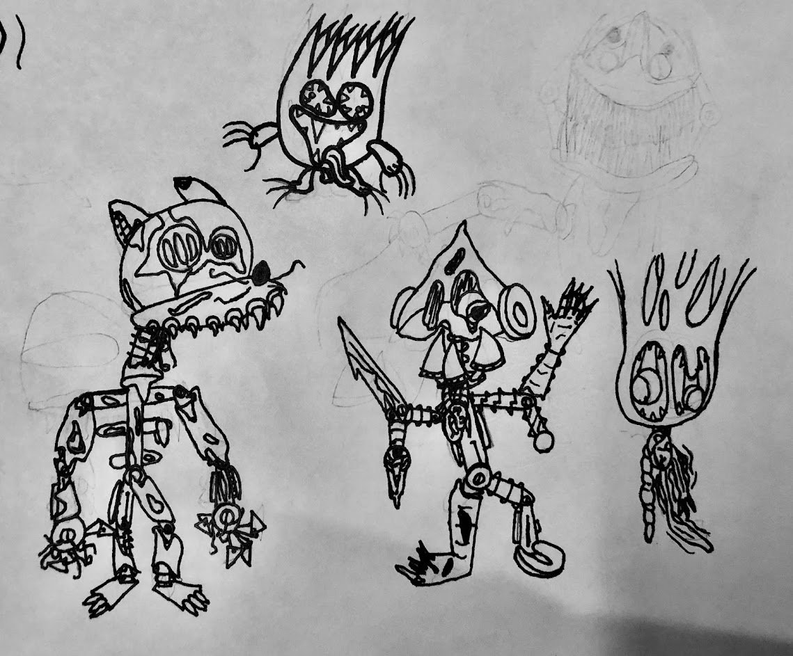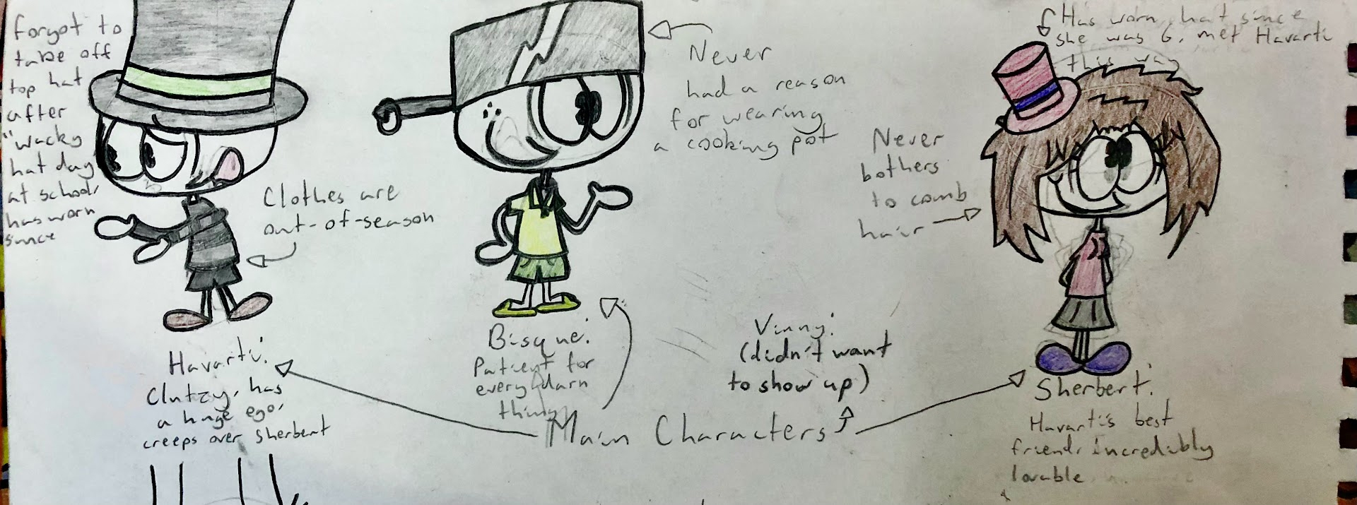 seventh grade is around when art sort of became my main interest. shortly after starting out with drawing fnaf fanart, i started using twitter and also discovered cartoons being uploaded to youtube by independent artists, both of which became large sources of inspiration (some people may be able to recognize one in particular that my art style at the time was blatantly ripping from). here you'll find old concept art, abandoned OCs, abstract stuff that i used to be really obsessed with creating, and some other stuff. i don't have any exact dates for this stuff, but i'm pretty sure all of it is from 2016 to 2017. some of my signatures have been blurred because i used to sign my real name on my art.