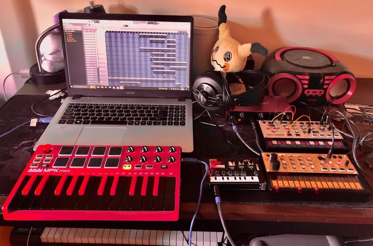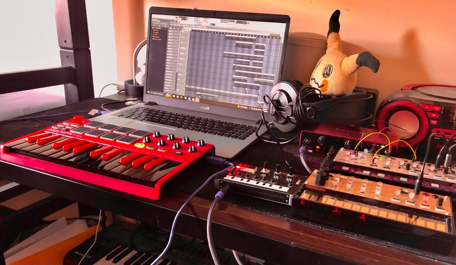 i have a handful of physical devices for making this stuff; MIDI controllers for more easily playing piano rolls or recording MIDI, synthesizers because it's nice to have an actual instrument you can physically interact with, and an audio interface for recording said synthesizers.