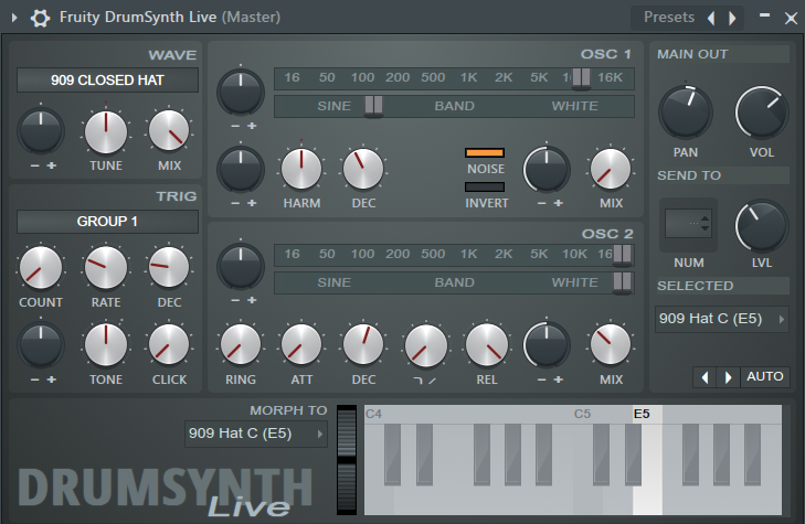 more recently, i've started using fruity drumsynth live, which has a bunch of presets that replicate the sounds of roland's tr-808 and tr-909 and are easily tweakable. i use a combination of both presets; i prefer the kicks, hats and crash cymbal of the 909 but also the clave, clap, maraca, rim, ride and especially the cowbell of the 808. the 808 kick can also be preferable if i'm going for a more artificial and heavy sound.