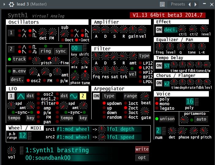 nearly all of the synths in my tracks are done using a freeware third-party plugin called synth1. i would not call myself a master of it but by now i am capable of designing my own synths to use in my tracks instead of relying almost entirely on other people's presets, which can still get you pretty far. it seemed intimidating at first, but it's actually very intuitive and using it has basically taught me all the ins and outs of subtractive synthesis.