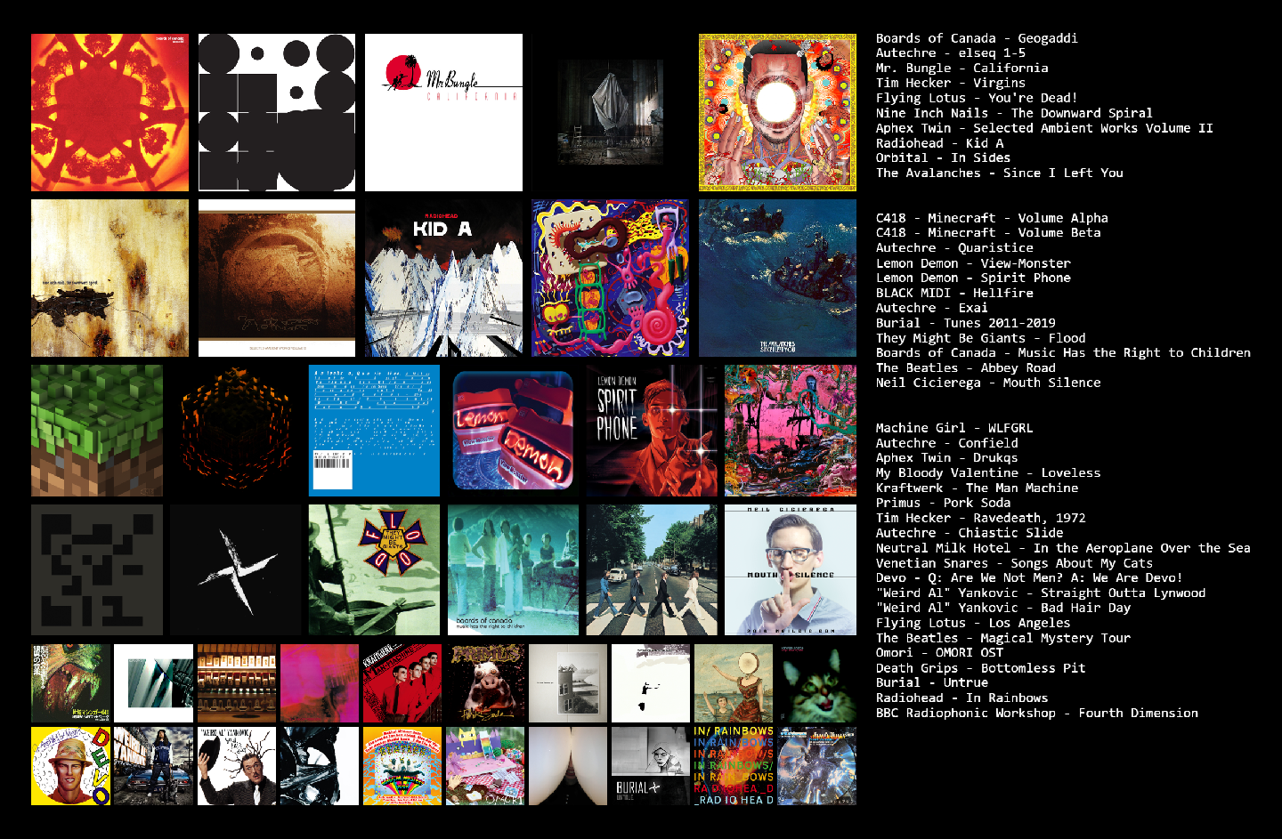 if it isn't made obvious by their five appearances on this list, i can say with some confidence that autechre is probably my favorite band/artist ever. incunabula is really the only album of theirs that i don't particularly like, and most of their albums are at least like an 8/10 for me. i also listen to their live material obsessively, particularly their 2016 and 2018 sets, which could honestly also collectively stand as a near 10/10 for me. i'm also a big fan of boards of canada, i've literally been listening to them for as long as i can remember (not kidding, the track turquoise hexagon sun is like the first song i have any memory of hearing in my childhood). i like all four of their albums a lot and i think their EPs and miscellaneous releases also have some good stuff.